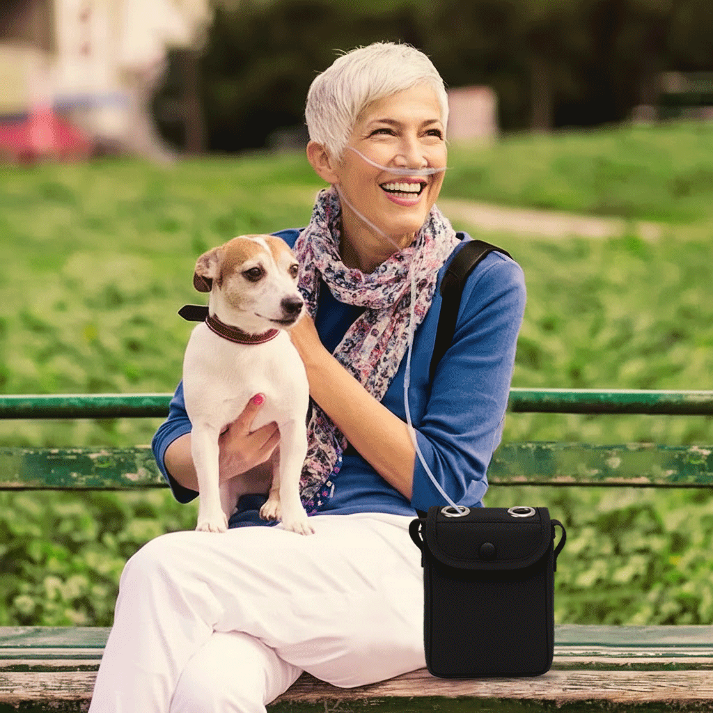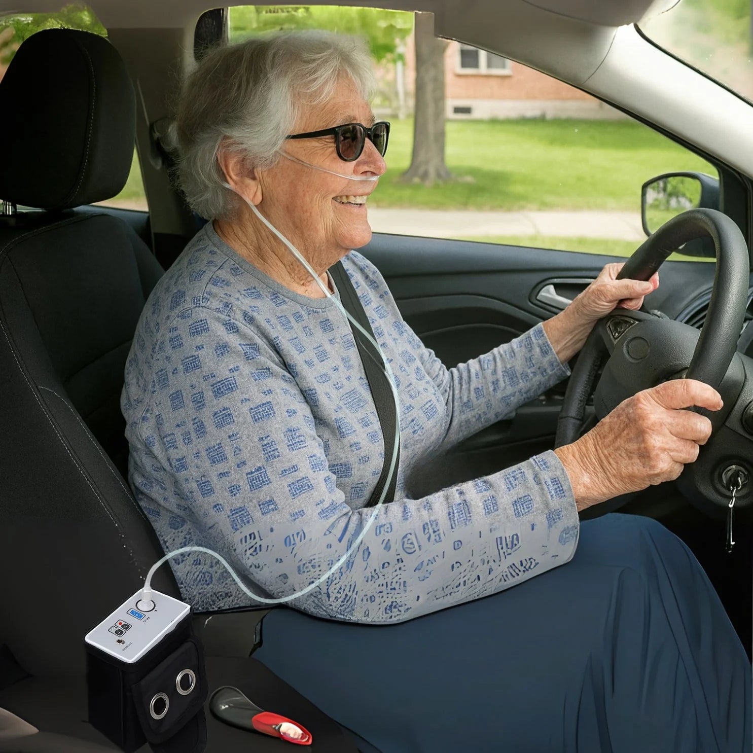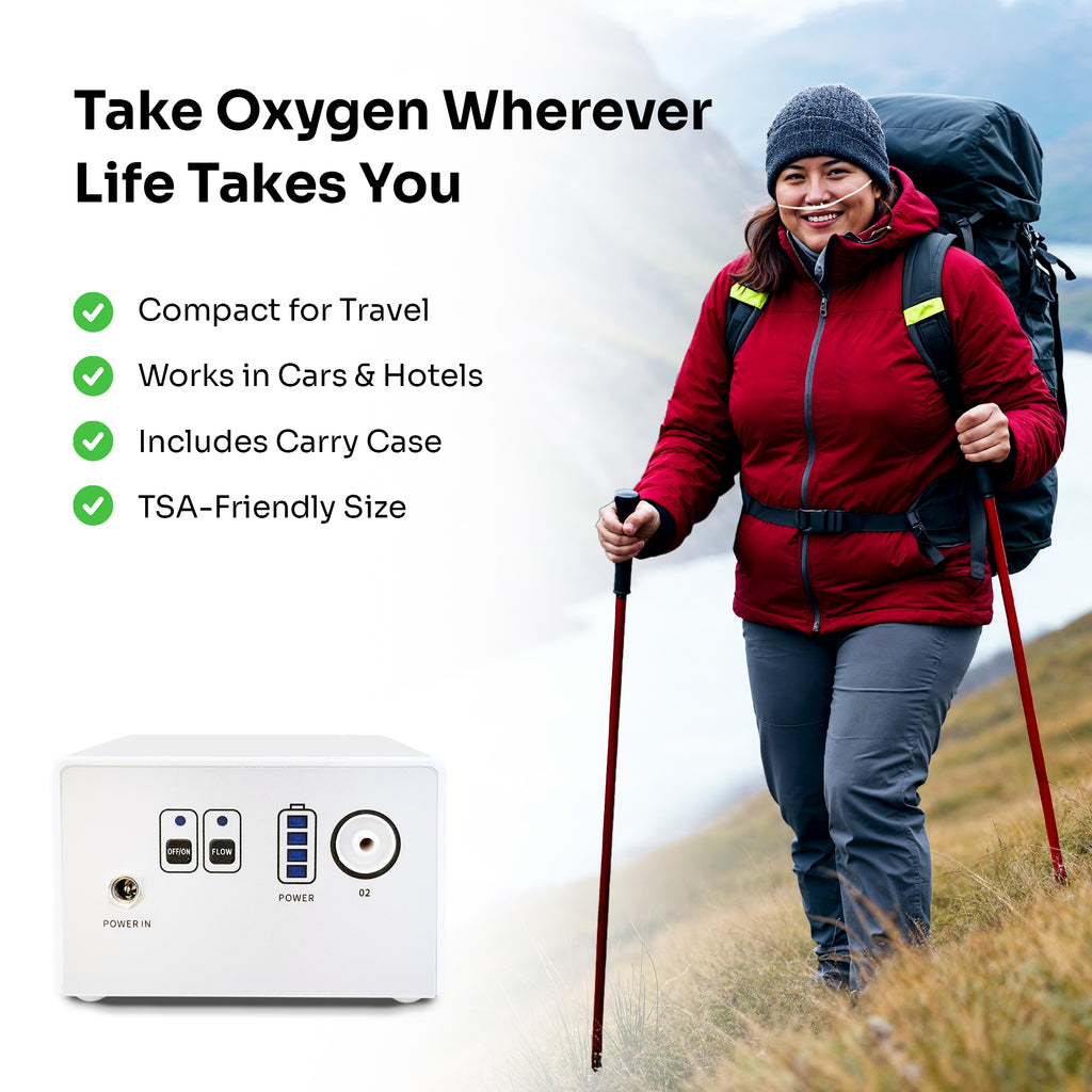 Lightweight and compact, designed with a carry handle and travel bag so you can take oxygen support anywhere at home, on the road, or outdoors.